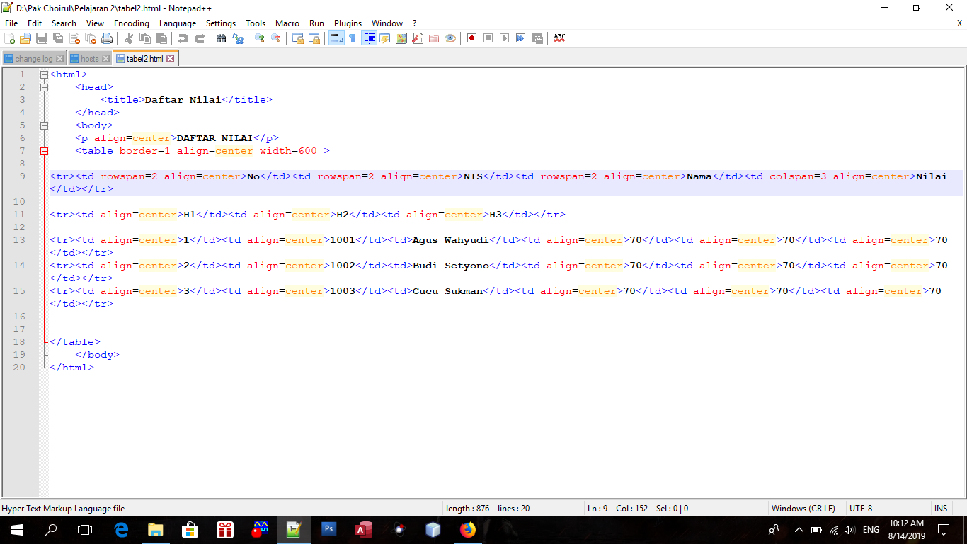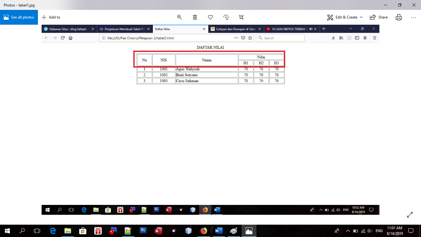 Dengan menyetting colspan menjadi “3”, kotak di barisan pertama akan melebar menjadi gabungan dari 3 kolom dari H1,H2,H3.Contohnya adalah kata NILAI pada gambar diatas.